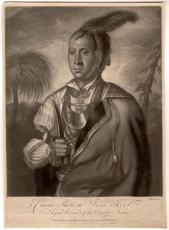 In a bid for peace and an effort to end enmity with the British, Cherokee leaders Cunne Shote, Ostenaco and 'Pouting Pigeon' arrived in London in 1762 with Lieutenant Henry Timberlake. The Cherokee delegation were described in the British press as "well made men, near six feet high, well dressed in their own country habit . . . (with painted faces and) heads adorned with shells, feathers, ear-rings and other ornaments."