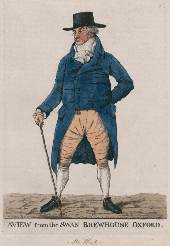 Known as 'Squire' Hall, he was the owner of the Swan Brewery in Oxford, and is said to have invited Robert Dighton to Oxford to draw a portrait of John Ireland, M.D. Some copies of this etching have been mis-inscribed 'Mr Swan'.