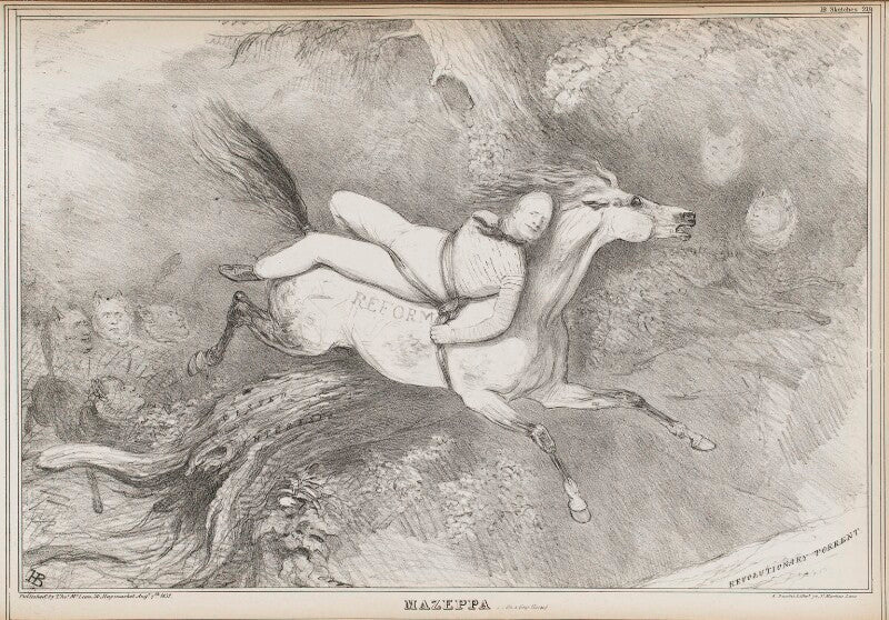 John Doyle based his satirical print on a reworking of a painting by the French artist Horace Vernet (1783-1863). 'Mazeppa et des Loups' or 'Mazeppa and the wolves' shows a scene from the romantic poem by Lord Byron, 'Mazeppa' (1819).