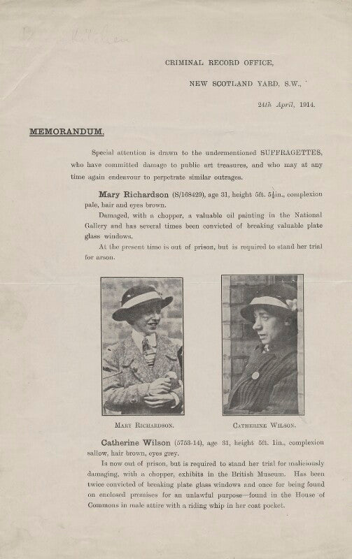 Shortly before the First World War, a new type of portraiture was born: the surveillance photograph. This document was issued by Scotland Yard to the National Portrait Gallery following Richardson’s attack on the painting known as the Rokeby Venus (The Toilet of Venus) by Diego Velázquez in March 1914. Richardson described her attack as a premeditated response to the re-arrest of Emmeline Pankhurst earlier that month. Catherine Wilson (also known as Clara Lambert) attacked a glass case in the British Museum and infiltrated the... more