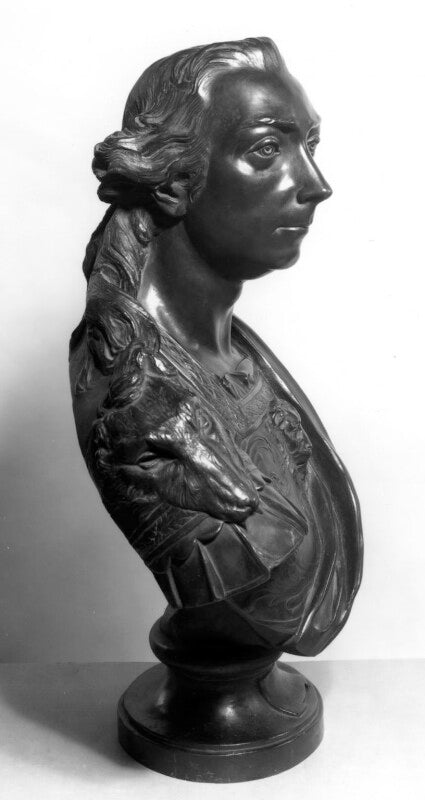 General James Wolfe was killed leading the attack that seized Quebec from the French in 1759. In designing this posthumous bust, Wilton allegedly rushed to Portsmouth to have Wolfe's newly-landed coffin opened so he could sketch his face. Wilton found it 'too much distorted', and had to rely on association to create an idealised portrait of a hero: the classical tunic and armour of an ancient Roman soldier and, more specifically, the wolf motifs on the shoulders - a pun on the General's name. More... more