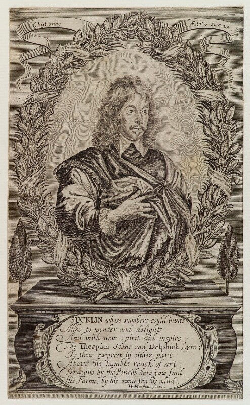 'The greatest gallant of his time, and the greatest gamester'; Suckling, an ardent Royalist, was forced to flee the country in the Civil war, and died in poverty in Paris, probably from taking poison. He wrote plays, notable for their convoluted plots, as well as some memorable lyrics, of which the best known is Why so pale and wan, fond lover?'.