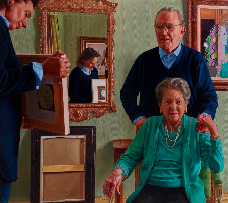 This portrait, painted from photographs taken by the artist Wim Heldens, winner of the BP Portrait Award 2011, reflects the Djanoglys' love of the visual arts and their dedication to one another. Depicted in the living room of their London home, their daughter, Simone, holds up a drawing by Lucian Freud entitled Pet Mouse (c.1944) from their collection. Heldens explained that Sir Harry gave the work to Lady Carol because her nickname was ‘mouse’. He says: ‘When I met them what I picked up... more