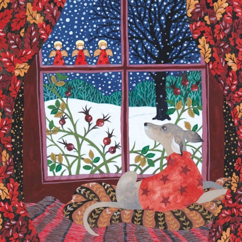 This set of 5 cards captures heart-warming holiday scenes, each featuring a sweet pup cosied up by the window, soaking in the festive magic of the season.